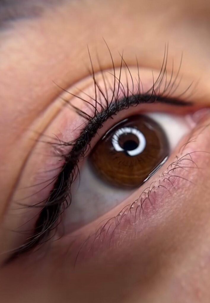 La laminazione delle ciglia rende lo sguardo intensamente curato e definito, senza l’uso di trucco pesante.